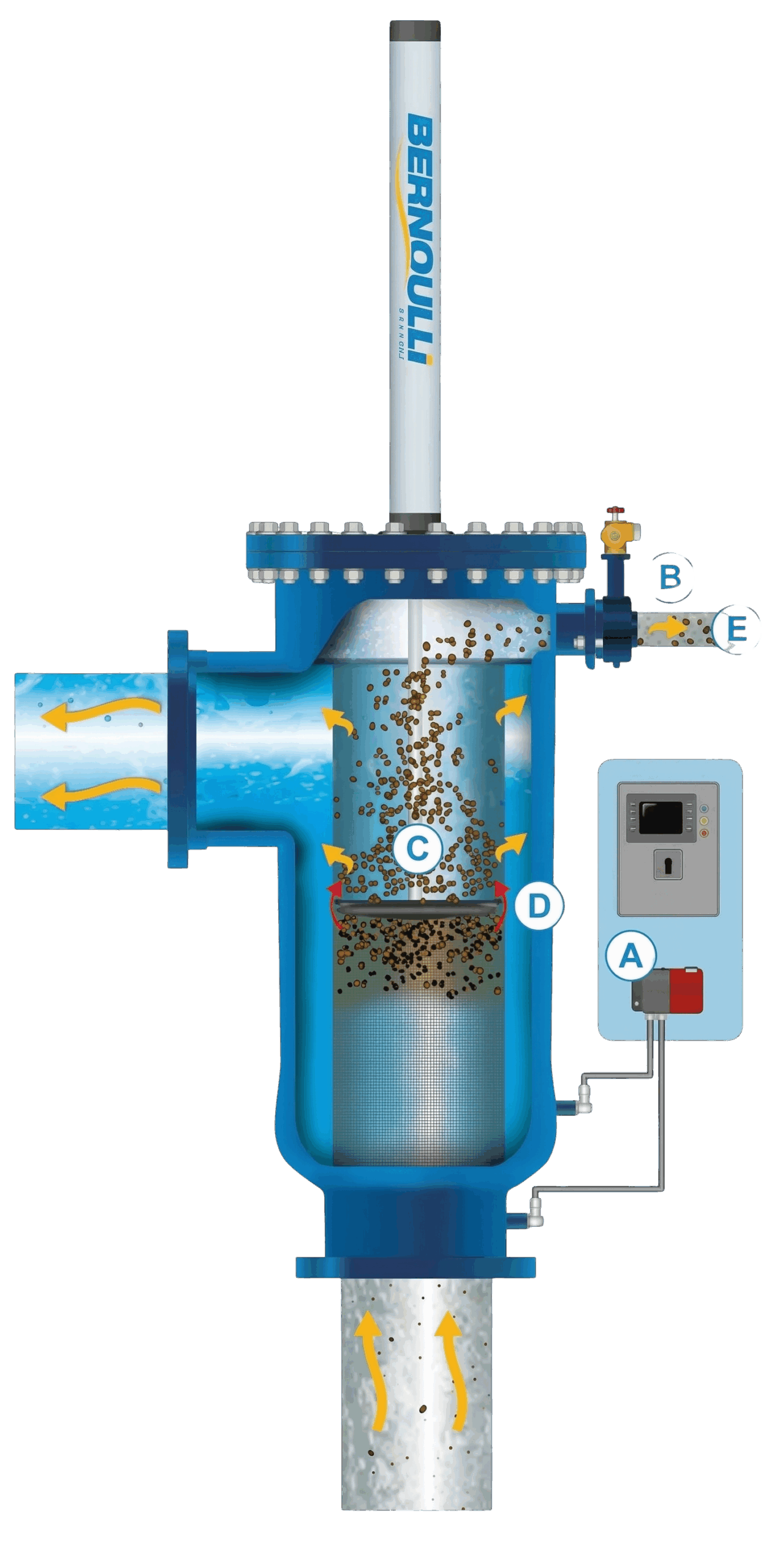 - Inicio: La secuencia de limpieza se inicia mediante la configuración de un temporizador o es activada por un sensor de presión diferencial, antes de que cualquier obstrucción provoque una reducción del caudal.
