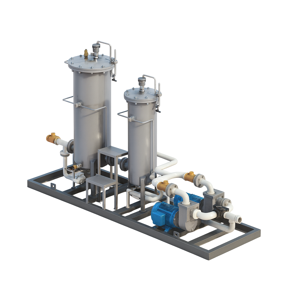 El bastidor estructural está diseñado para facilitar el transporte e instalación en planta, incorporando colectores integrados, válvulas de aislamiento, drenajes y puntos de muestreo.
