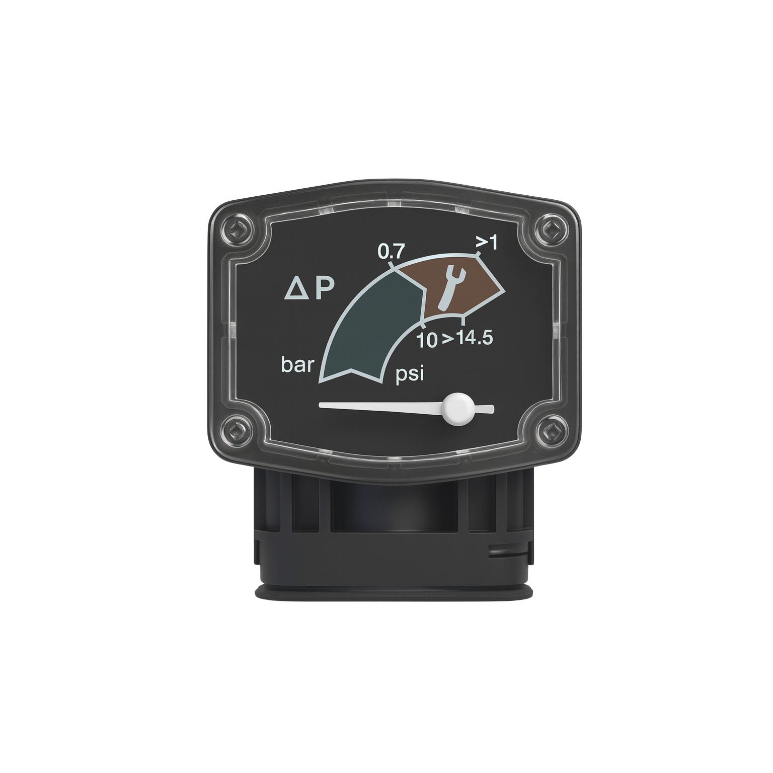 El indicador muestra la diferencia de presión entre la entrada y la salida de la carcasa. Esta lectura permite al operador conocer cuándo los elementos filtrantes están saturados y deben ser reemplazados, evitando el colapso del filtro y optimizando el consumo de energía.