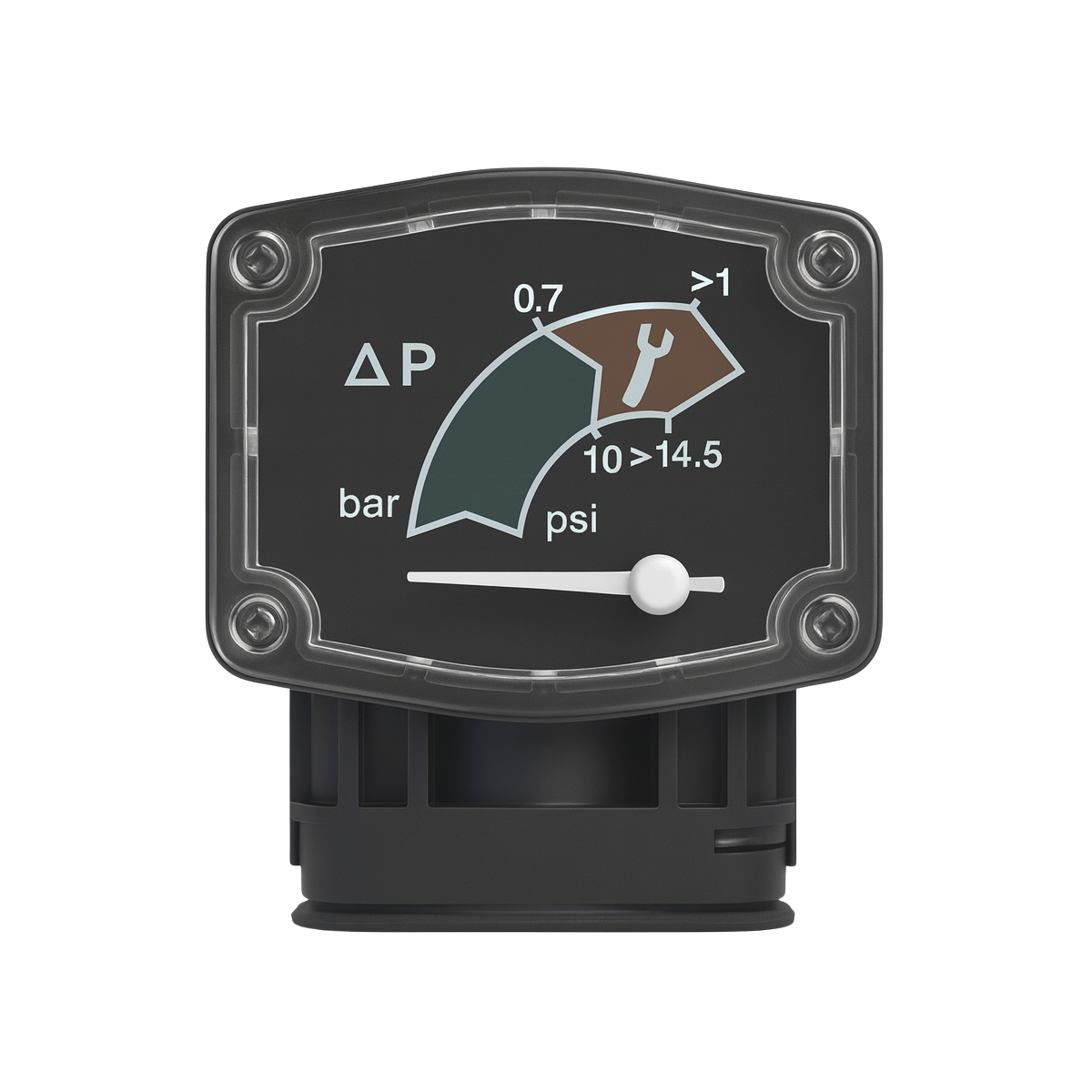El indicador muestra la diferencia de presión entre la entrada y la salida de la carcasa. Esta lectura permite al operador conocer cuándo los elementos filtrantes están saturados y deben ser reemplazados, evitando el colapso del filtro y optimizando el consumo de energía.